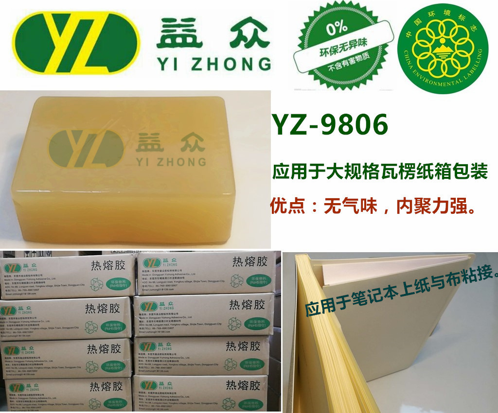 YZ9806是一款浅黄色热熔压敏胶,无气味,内聚力强,专业应用于大规格瓦楞纸箱包装及EVA基材等。